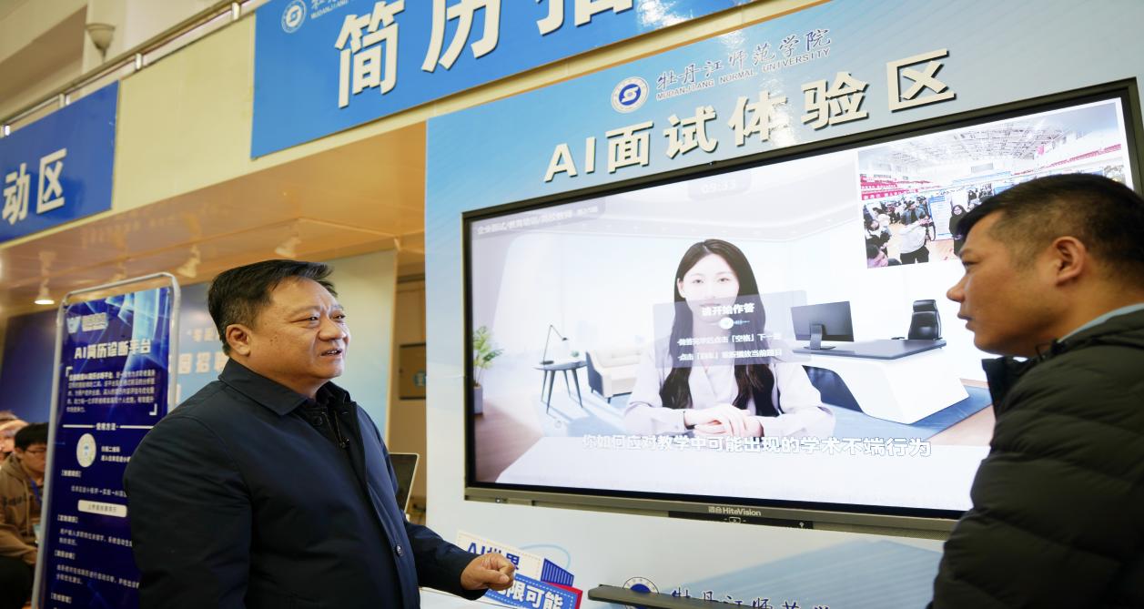 党委书记王志浩,副院长、党委常委张晓祥与各用人单位深入交流,了解用人单位招聘需求、毕业生在应聘过程中的现实表现及往届毕业生在就业岗位的工作状态等,并就人才培养、就业工作、服务保障等方面与用人单位进行探讨,希望用人单位多为学校的人才培养提出宝贵意见。王志浩书记到AI面试体验区,化身“就业体验官”,亲身体验AI面试指导。