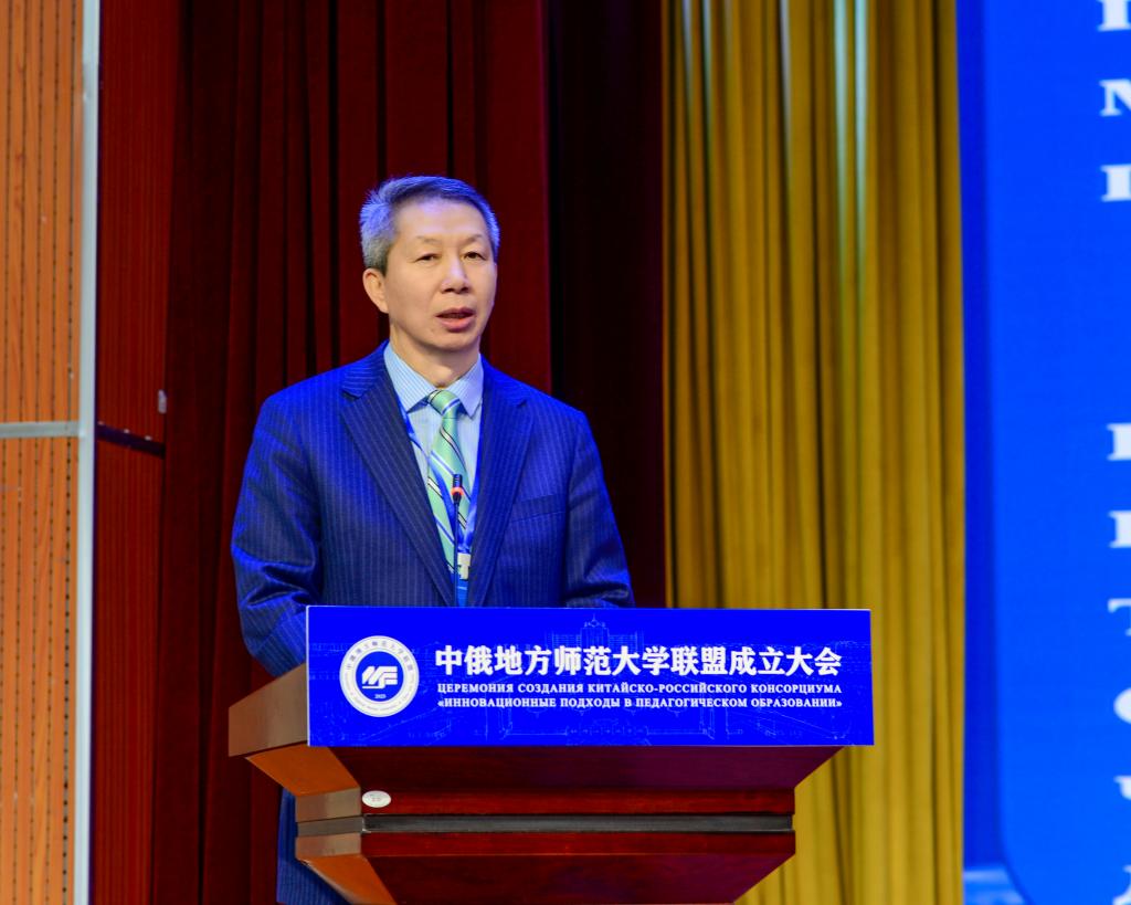黑龙江省教育厅总督学刘兆国致辞,他指出,牡丹江师范学院地处对俄教育合作最前沿,长期以来发挥师范教育特色,与乌拉尔联邦大学等俄罗斯高校开展了卓有成效的教育交流合作。本次中俄地方师范大学联盟的成立,填补了我省中俄师范类高校联盟空白,进一步壮大了中俄同类大学联盟集群规模,丰富了联盟类型,为我省凝聚中俄地方师范院校力量,提升中俄师范教育建设水平,强化中俄师范人才培养能力搭建了国际化交流平台。他希望联盟成员单位以本次联盟成立大会为契机,加强学术交流、深化联合培养、推动科研合作、共享发展成果,为中俄两国高等教育事业的高质量发展贡献力量。