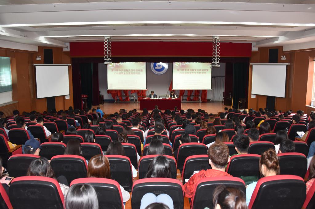 5月30日下午,学校党委党校第27期中共预备党员培训班暨2018届毕业生党员培训班在春秋讲坛举行。学校党委书记、校党校校长王育伟,学校党委副书记杨春文分别为培训班做专题党课辅导。全校学生党支部书记、教职工预备党员、学生预备党员和2018届毕业生党员,共计350余人参加了培训。本次培训班由组织部副部长孙蕾主持。