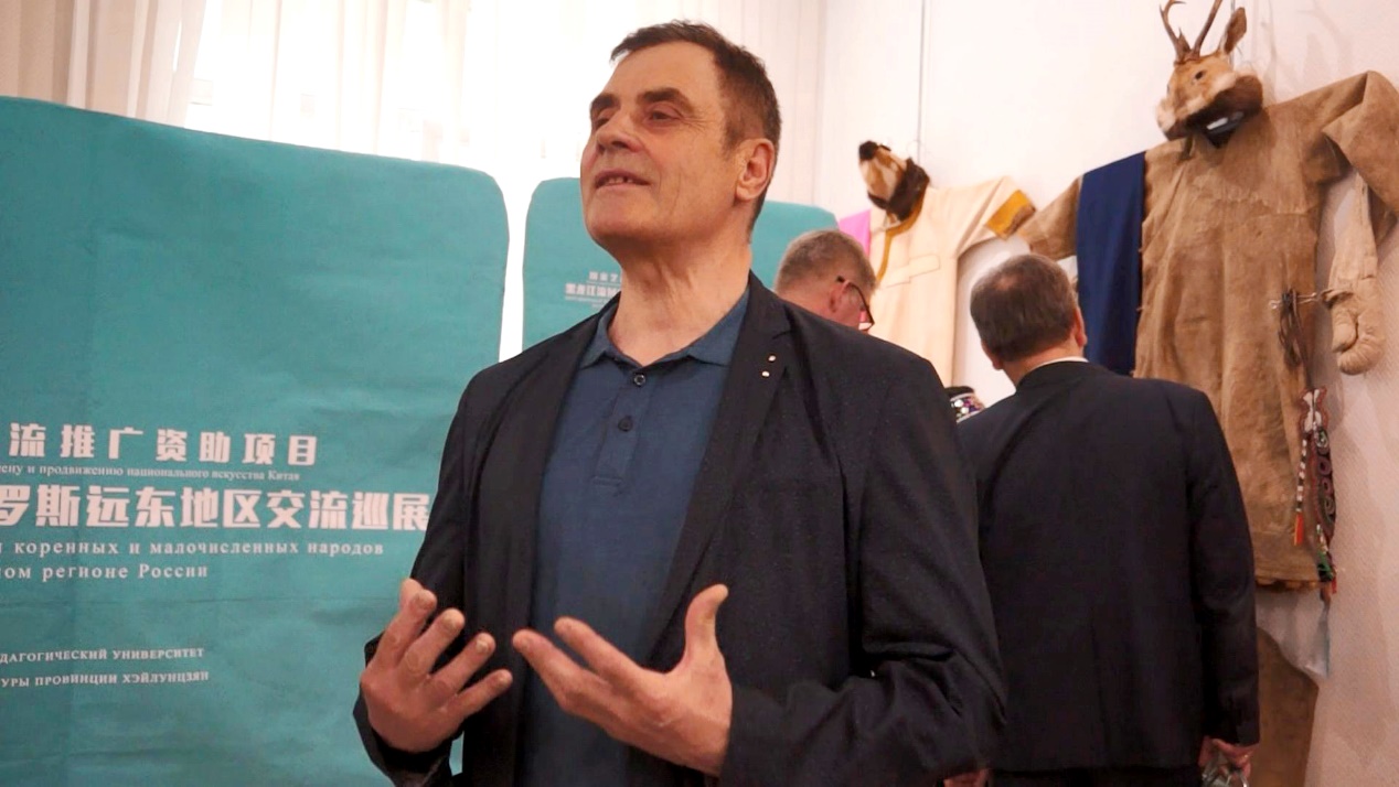 学者谢尔盖教授认真地研究充满东北民俗风情的鱼皮画、鱼皮服饰,对中国艺术家汲取民风民俗精华、就地取材、大胆创意的“中国智慧”表示钦佩。