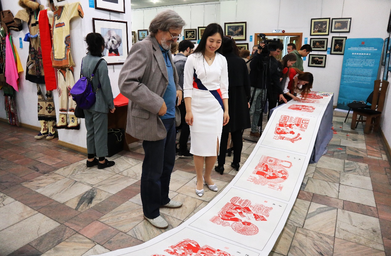 水彩画家弗拉基米尔与海伦剪纸艺人穆婷婷交流海伦剪纸技艺