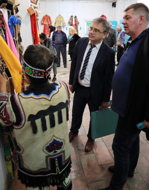 远东联邦大学分校谢尔盖校长倾听鄂伦春族兽皮服饰制作传承人关金芳讲解民族服饰文化
