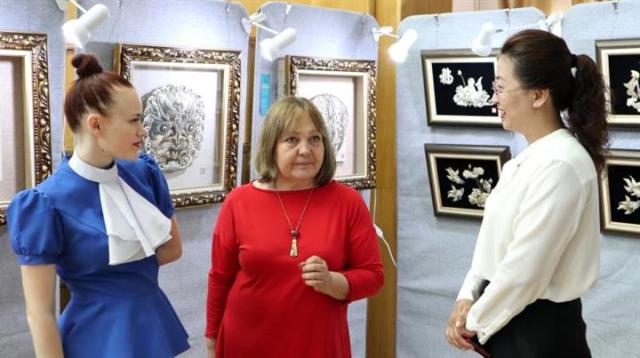 俄方电视台采访展会中国艺术家手工制作现场