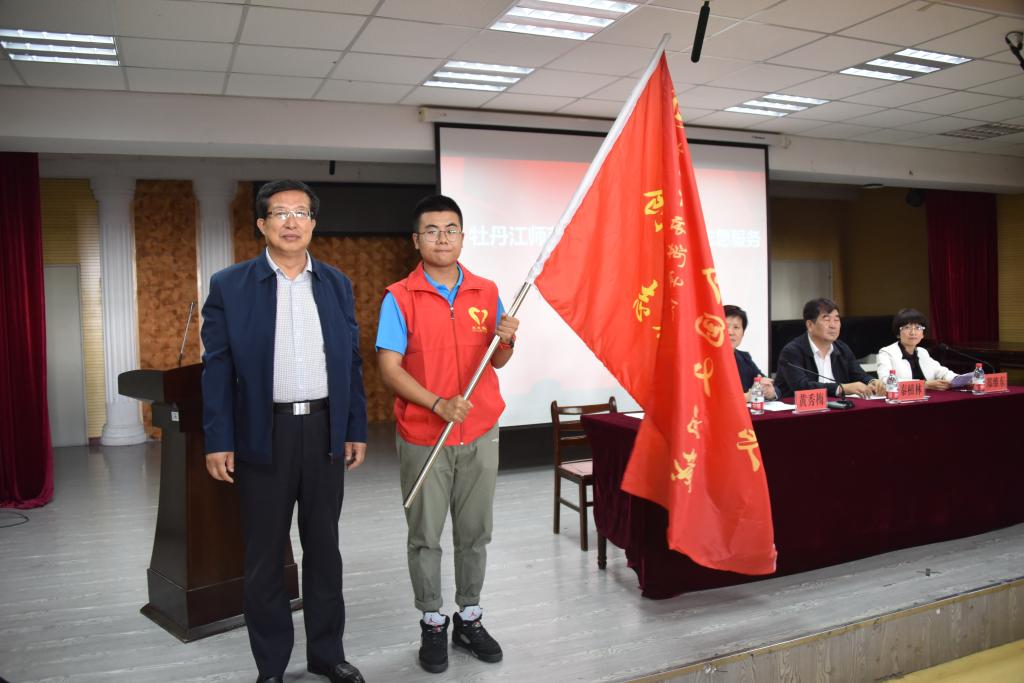牡丹江市委宣传部部务委员杨荣江同志为牡丹江师范学院创建全国文明城志愿服务队授旗