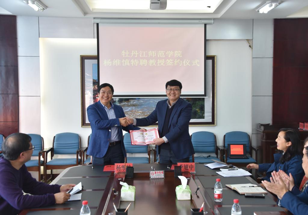 12月19日下午,聘请中国科学院大连化学物理研究所杨维慎研究员为我校特聘教授的签约仪式在综合楼1203会议室举行。副校长李旭中代表学校与杨维慎研究员签订了协议并颁发了牡丹江师范学院特聘教授聘书。各二级学院院长出席了签约仪式。签约仪式由科研处金志民处长主持。