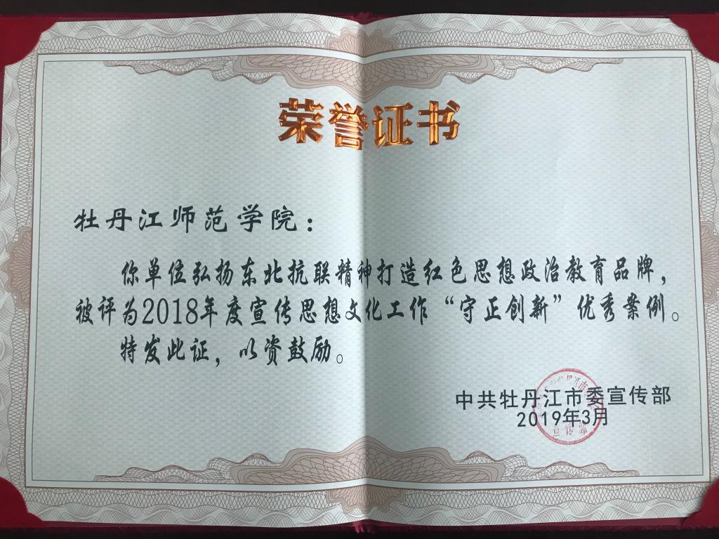 3月14日,全市宣传思想文化工作会议在江南党政会议中心举行。会上,我校典型案例“牡丹江师范学院 弘扬东北抗联精神打造红色思想政治教育品牌”被市委宣传部评为“2018年全市宣传思想文化工作‘守正创新’优秀案例”。