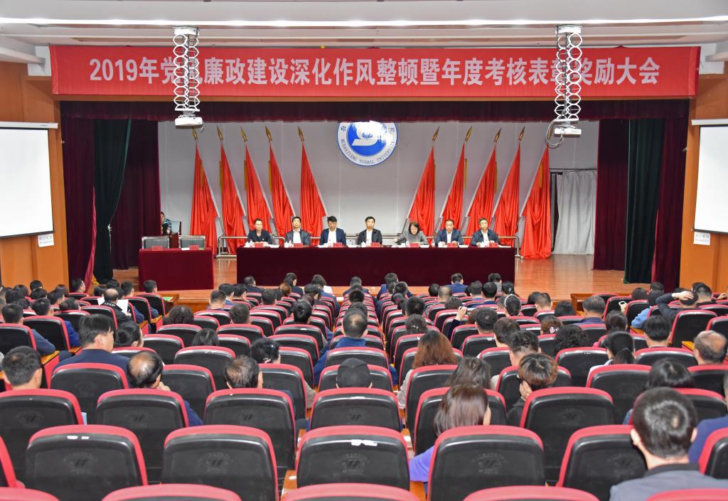 会上,党委常委、纪委书记刘峰作了题为《围绕中心服务大局 锐意进取 推动学校党风廉政建设工作高质量发展》的工作报告,全面总结了2018年学校党风廉政建设及深化作风整顿工作情况,部署了2019年党风廉政建设重点工作任务;副校长李旭中作了学校2019年作风整顿工作方案的说明;党委常委、副校长杨敬民作了学校2018年度考核工作情况的说明;党委常委、副校长张冬宣布了《关于表彰奖励2017年度、2018年度考核先进单位的决定》;党委常委、工会主席张艳霞宣布了《给予2018年9个教学单位绩效考核试点单位奖励的决定》。随后,校领导为2018年度考核先进单位文学院、数学科学学院、化学化工学院;团委、创业就业指导中心、组织部、宣传统战部、学生工作部颁奖。
