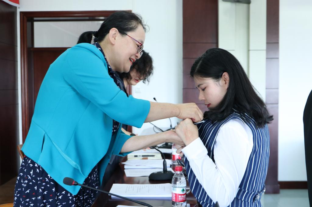 梁校长强调,现在正值学校升级发展、办学水平和层次提升的关键时期,新入职教师要把人才培养、科学研究、社会服务、文化传承创新的使命担当,与日常教学科研工作紧密结合起来,勇于承担压力,明确岗位目标,切实提升教学能力和科研水平,认真学习贯彻《新时代高校教师职业行为十项准则》,为学校建设黑龙江省东南部地区高水平师范大学的建设目标作出积极贡献。随后梁校长和董处长为新入职青年教师佩戴了校徽。