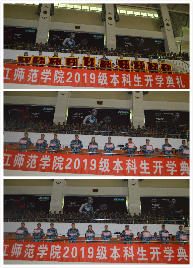 伴随着庄严的国歌,国旗和校旗冉冉升起,全体师生起立面向国旗行注目礼。礼毕,党委常委、副校长杨敬民宣读了《军训团嘉奖令》。大会决定,决定授予文学院王潇仪等213人为先进个人称号;授予学生3号公寓105寝室等126个寝室为优秀寝室称号;授予物理与电子工程学院10连、计算机与信息技术学院13连、历史与文化学院15连、化学化工学院17连、体育科学学院20连、西方语言学院21连、应用英语学院23连、音乐与舞蹈学院29连、美术与设计学院33连、经济与管理学院36连等10个连队为先进连队奖;授予刘夫磊、李硕、赵启航、吕成龙、张强、谢旭、霍旭、王松、柏洪瑞、姜飞鸿10人为“优秀教官”称号。