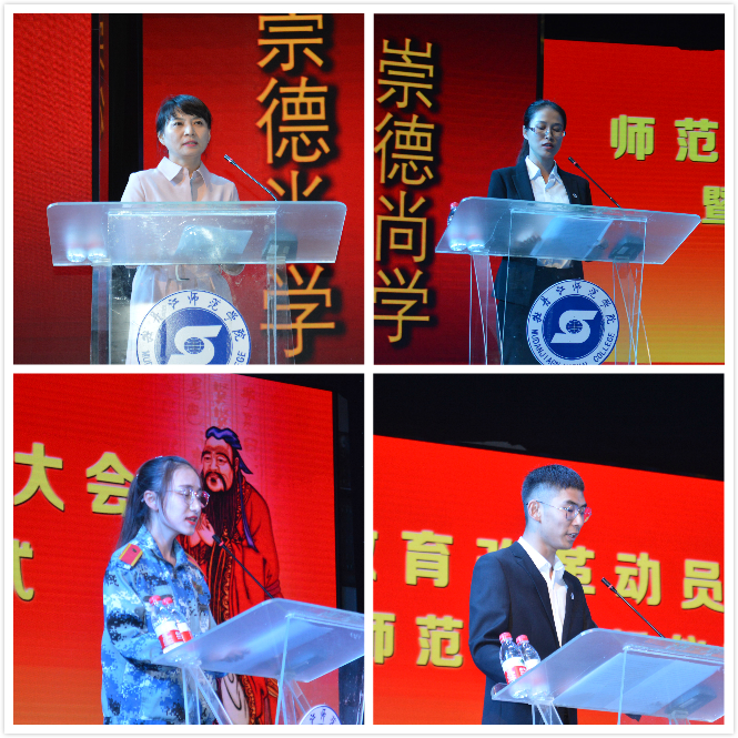 校长梁中贤在会上讲话。她要求全体师范生:一是要严格按照“四有好老师”标准,在学校各项活动中率先垂范,善为人师做表率;二是要严格树立“四个相统一”的思想,为改革开放和社会主义现代化建设服务;三是要严格师范生培养程序,贯彻“五个认真、一个准时”的原则。各部门要严格落实《牡丹江师范学院深化师范教育改革实施方案》的要求,创新师范生教育、学习和生活管理方式,激发师范生的潜能和学习热情,提高他们的生活和实践能力,改革师范专业评价方式。