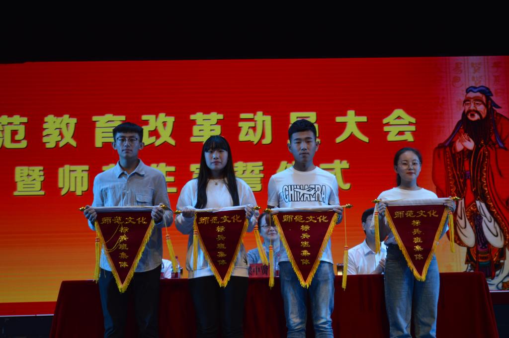 与会校领导为2018级四个师范班级颁发“师范文化标兵班集体”流动锦旗