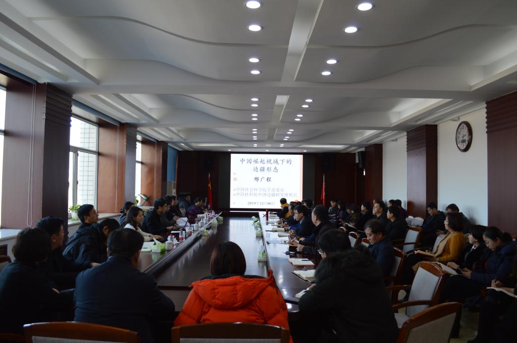 12月6日下午,学校在综合楼1206会议室召开校党委理论学习中心组(扩大)学习会议。中国社会科学院中国边疆研究所所长邢广程研究员应邀来校作报告。学校党政领导王志浩、梁中贤、李旭中、杨敬民、秦植林出席会议;校党委理论学习中心组成员,全校正处级干部参加会议。会议由党委书记王志浩主持。