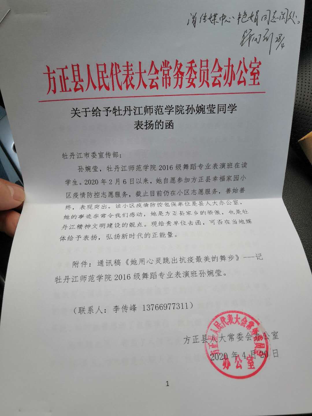 近日获悉,牡丹江市委宣传部收到一封来自方正县人大常委会的感谢信,对我校音乐与舞蹈学院2016级舞蹈专业表演班孙婉莹同学为当地疫情防控工作贡献青春力量表示赞扬和感谢,对我校人才培养质量和落实立德树人根本任务的成效给予充分肯定。