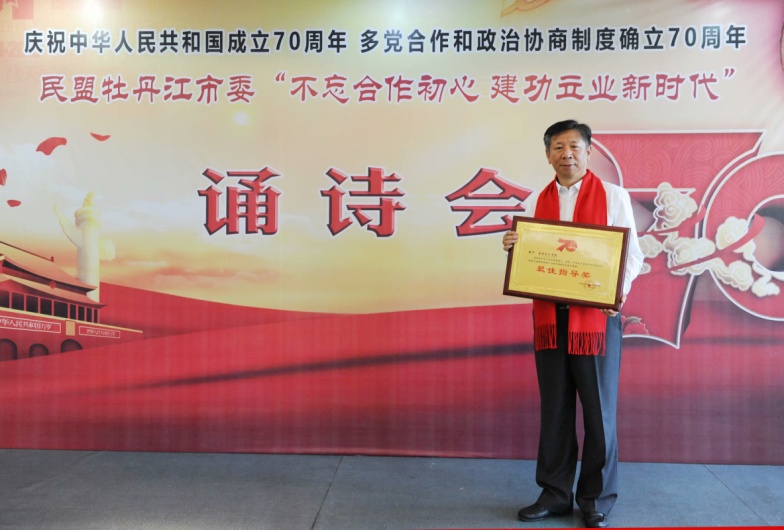 从学校迎接教育部合格评估,到学校50和60年校庆中,他都积极参与,有价值的方案和建议总能受到学校和领导的好评;在宣传和报道学校的发展中,他更是发挥自己的作用,他撰写的报道《重走“抗联路”的感与悟》在民盟省委的网站和公众号上发表;他聚焦学校发展,弘扬社会正气,以多种形式向学校宣传统战部提交的《关于深化校园文化建设的意见》和《打造雪城红色文化品牌》等建言,受到各级领导的肯定:在我校中国抗联研究中心的活动中,他更是走在前头,主演抗联大戏,带头创作抗联主题绘画《白山黑水》,组织学生创作组画《抗联英雄谱》;在在我校组织的民主人士和优秀教师“重走抗联路”的活动中,他参与策划、组织、发言和写报道,让活动有了别样的色彩;在民盟市委召开的“庆祝新中国成立七十周年经典诵读活动”中,他下到基层为大家热心辅导,被民盟市委授予“特殊贡献奖”。