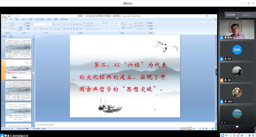6月20日下午,我校特聘教授傅道彬先生在博雅云讲座平台做了题为《“六经”与“轴心时代”的思想和文学突破》的学术讲座。我校相关学科教师、学生以及慕名参加的全国学界同仁、学生近300人聆听了讲座。讲座由我校中国古代文学学科带头人宋娟教授主持。