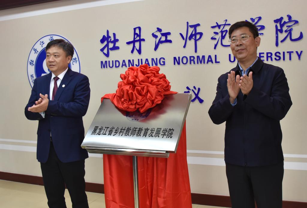 黑龙江省教育厅副厅长姜同河与我校党委书记王志浩为黑龙江省乡村教师教育发展学院揭牌