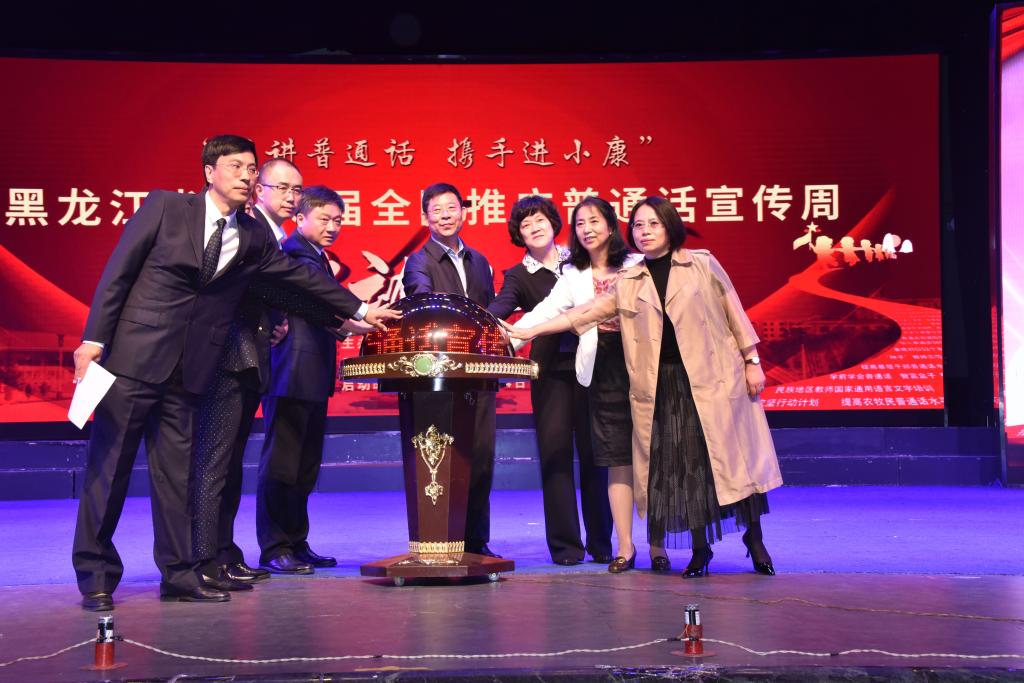 姜同河副厅长宣布黑龙江省第23届全国推广普通话宣传周启动仪式正式启动,并与与会领导共同按下启动球,标志着全省推广普通话宣传周活动正式启动。