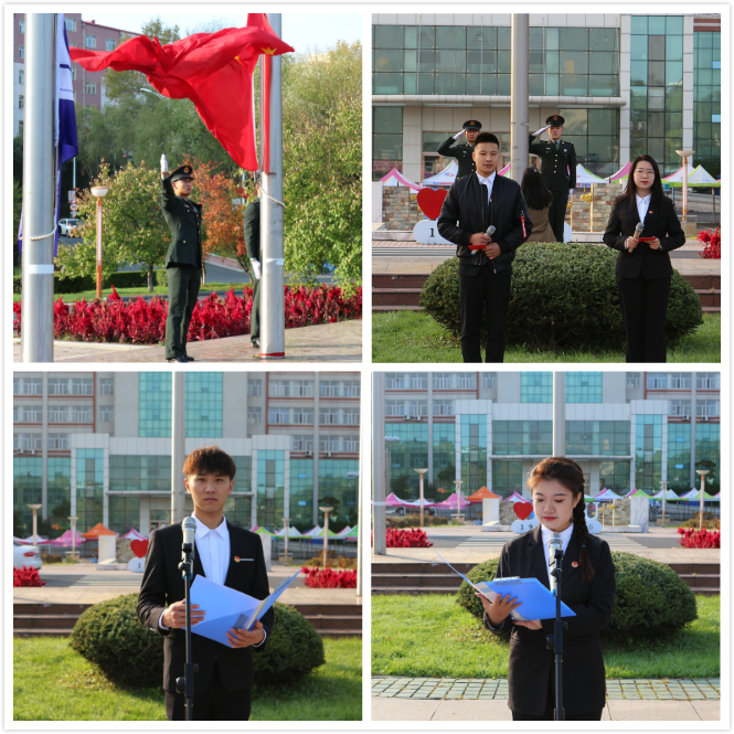 升旗仪式在激昂振奋的国歌中拉开序幕。校学生自律委员会两名退伍军人将国旗庄严升起,全体师生神情庄重,目光跟随国旗流转,把对党和国家的热爱融入到虔诚的注目礼中。随后,《神圣的使命》前奏播放,校旗伴随着校歌冉冉升起。当疫情侵袭之际,我校学子奋勇当先,投身抗疫一线,学校团委组建了牡丹江师范学院驻绥芬河战疫志愿者临时团支部。团支部书记、生命科学与技术学院曲孟园在升旗仪式上代表我校所有参与疫情防控的志愿者发言,展现了我校团员青年的责任与担当,向祖国和家乡人民交出了一份满意答卷;文学院李强等6名同学朗诵的《中国英雄与中国力量》告诫祖国青年不能忘记民族脊梁;经济与管理学院团总支副书记姚安琪代表全体团员青年宣读《你我“疫”同守护 共建文明校园——致全体团员青年的倡议书》,号召全体团员青年用坚强而温暖的青春力量,持之以恒做好疫情防控工作,彰显新时代青年的作为与担当。
