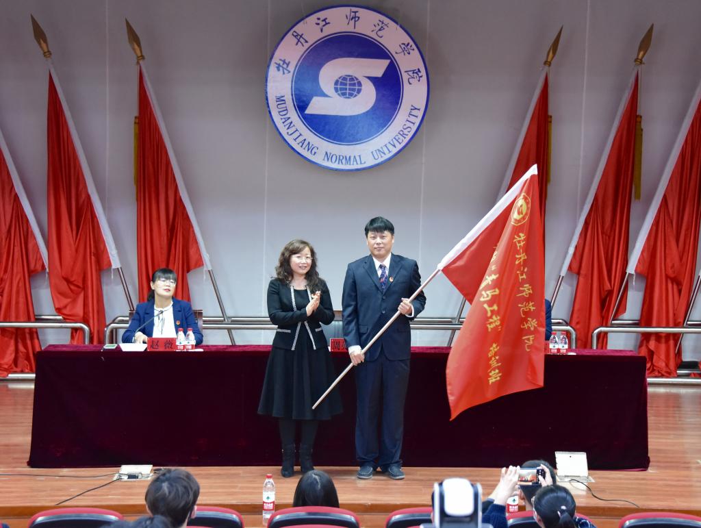 学生工作部部长周英会为“青马工程”培训班班主任授旗