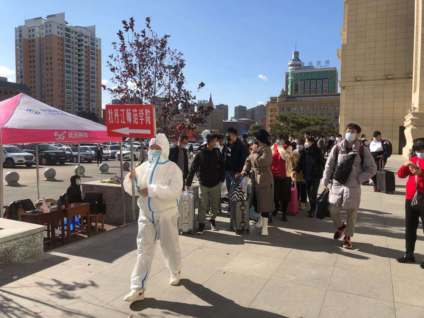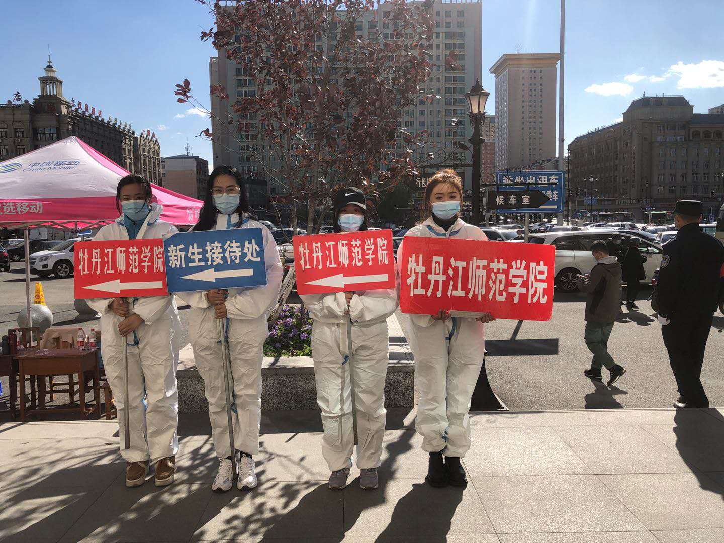 为了尽量减少新生与其他人员接触,今年学校在火车站、客运站和飞机场都设置了接待处,安排专门车辆迎接学生,严把疫情防控第一关。教师和学生志愿者从早上5:30开始,全天坚守在接待处,第一时间为新生和家长送上学校的温暖和关怀。