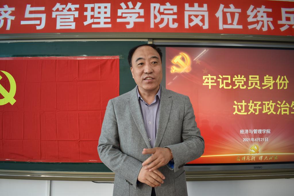 为推进党史学习教育开展,进一步巩固“不忘初心、牢记使命”主题教育成果,强化党员教育管理,提升党员的身份意识,发挥党员的先锋模范作用,切实增强党组织的战斗力和凝聚力,4月21日下午,经济与管理学院在文科楼409室开展党员“政治生日”主题党日活动。校党委副书记刘峰、组织部副部长佟亚辉观摩本次活动,经济与管理学院党政领导、全体教师党员参加了本次活动,活动由经济与管理学院党委副书记常大治主持。