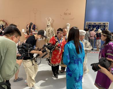 展会现场还展出了独具黑龙江地域民族特色的赫哲族鱼皮服饰,牡丹江师范学院鱼皮技艺研修班学员高亚荣、付君、张丽、李秀香等4名学员接受了新华网记者的现场采访,在新华网“文化和自然遗产日”特别节目《中国博物馆公开课》中介绍了赫哲族鱼皮服饰的制作技艺,58.6万人新华云平台观看了直播节目。
