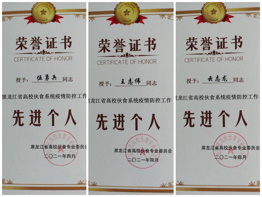近日,黑龙江省高校伙食系统疫情防控工作先进集体和先进个人评选结果公布,我校食堂荣获“黑龙江省高校伙食系统疫情防控工作先进集体”荣誉称号,伙食科负责人伍勇兵、思园餐厅经理王志伟、教工餐厅管理员云志龙被评为“黑龙江省高校伙食系统疫情防控工作先进个人”。