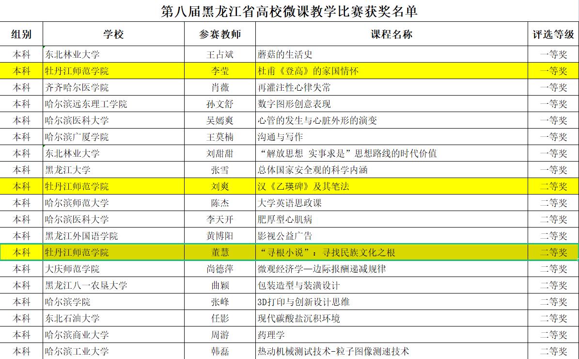 近日,黑龙江省高师培训中心公布了“第八届黑龙江省高校微课教学比赛获奖名单”,我校文学院教师李莹的作品《杜甫<登高>的家国情怀》荣获微课教学比赛本科组一等奖,美术与设计学院刘爽老师的作品《汉<乙瑛碑>及其笔法》、文学院董慧老师的作品《“寻根小说”:寻找民族文化之根》荣获微课教学比赛本科组二等奖;美术与设计学院战冠红老师的作品《立体构成——点立体构成》、历史与文化学院金玫老师的作品《人口与发展》荣获青年教师多媒体课件制作大赛本科组二等奖,美术与设计学院刘硕老师的作品《公共景观设计——装置艺术》荣获青年教师多媒体课件制作大赛本科组三等奖。我校荣获“第八届黑龙江省高校微课教学比赛优秀组织奖”。