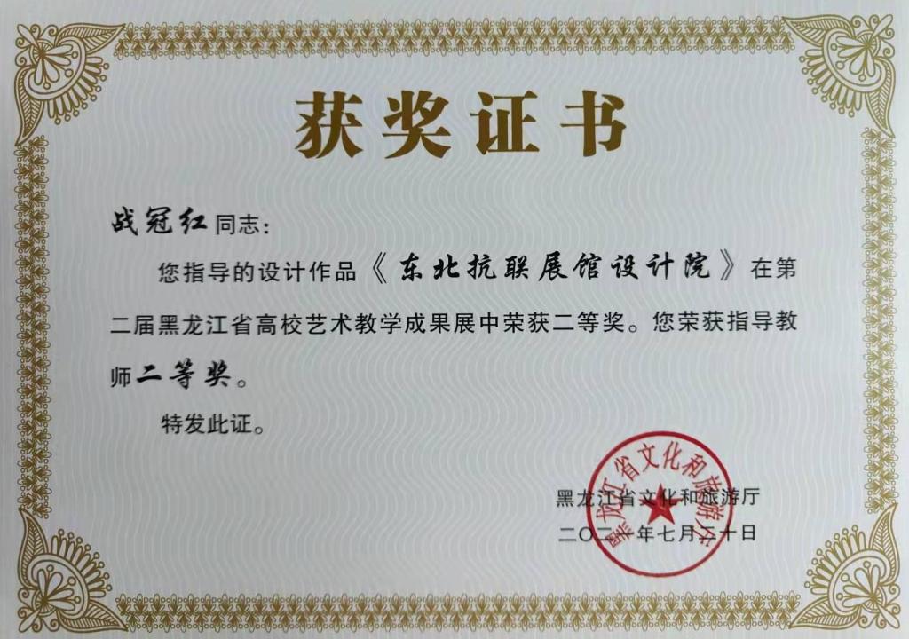 我校积极组织师生参加,共创作作品187件,经学校组织专家评审,择优推荐参展作品36件。经由省内外专家组成的评审委员会评比选拔,美术与设计学院教师刘爽的书法作品《文赋》荣获第二届黑龙江省高校艺术教学成果展一等奖;美术与设计学院教师战冠红指导的设计作品《东北抗联展馆设计院》荣获第二届黑龙江省高校艺术教学成果展二等奖,战冠红荣获优秀指导教师二等奖;美术与设计学院教师潘驰宇、李传刚,学生杨哲、王法睿等9人荣获第二届黑龙江省高校艺术教学成果展三等奖9项。