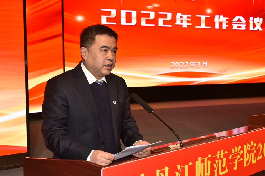 李春江院长指出,2022年学校全局重点工作任务有:加强党建和宣传思想工作,为学校发展提供政治保障。筹备学校第七次党代会,全面凝聚学校发展共识;力争获批国家师范教育协同提质计划支持学校;专业建设争取获批国家级一流专业建设点2-3个,做好省级应用师范专业集群工作,落实立德树人根本任务,加大经费投入,鼓励学生参加学科竞赛,努力培养卓越人才,汇集资源,打造学科特色优势,催生学科新的增长点。在服务地方上,力争获批省级首批现代产业学院。全力迎接好第二轮教育教学审核评估。聚焦第五轮学科评估和全国专硕水平评估结果,强化体制建设,高质量完成7个授权点的年度合格评估报告,启动4个学位授权点的专项评估。获得共青团省级荣誉,力争国家级荣誉。加大招生宣传,保证生源质量。争创省级高校心理健康教育示范中心。加大四所免费培训班的宣传引导,优化课程设置、加强师资配备,推进职业技能培训,普及教师资格证免试范围。完成网上服务大厅建设,推进IPV6的基础网络设施规模部署和应用升级。扩大高等学历继续教育规模,增设三个招生专业,今年继续教育学院招生将达到1200人以上。组织完成学前教师培训项目,完成少数民族地区语言文字的能力培训,推进乡村教师专业发展平台建设,积极争取新的国培省培计划项目。加强师生双向交流,推进交换生奖学金、短期游学、研学等项目的合作,积极探索开展线上交流活动。积极推进与俄罗斯和白俄罗斯等国家的学校建立合作关系,填补我校空白。