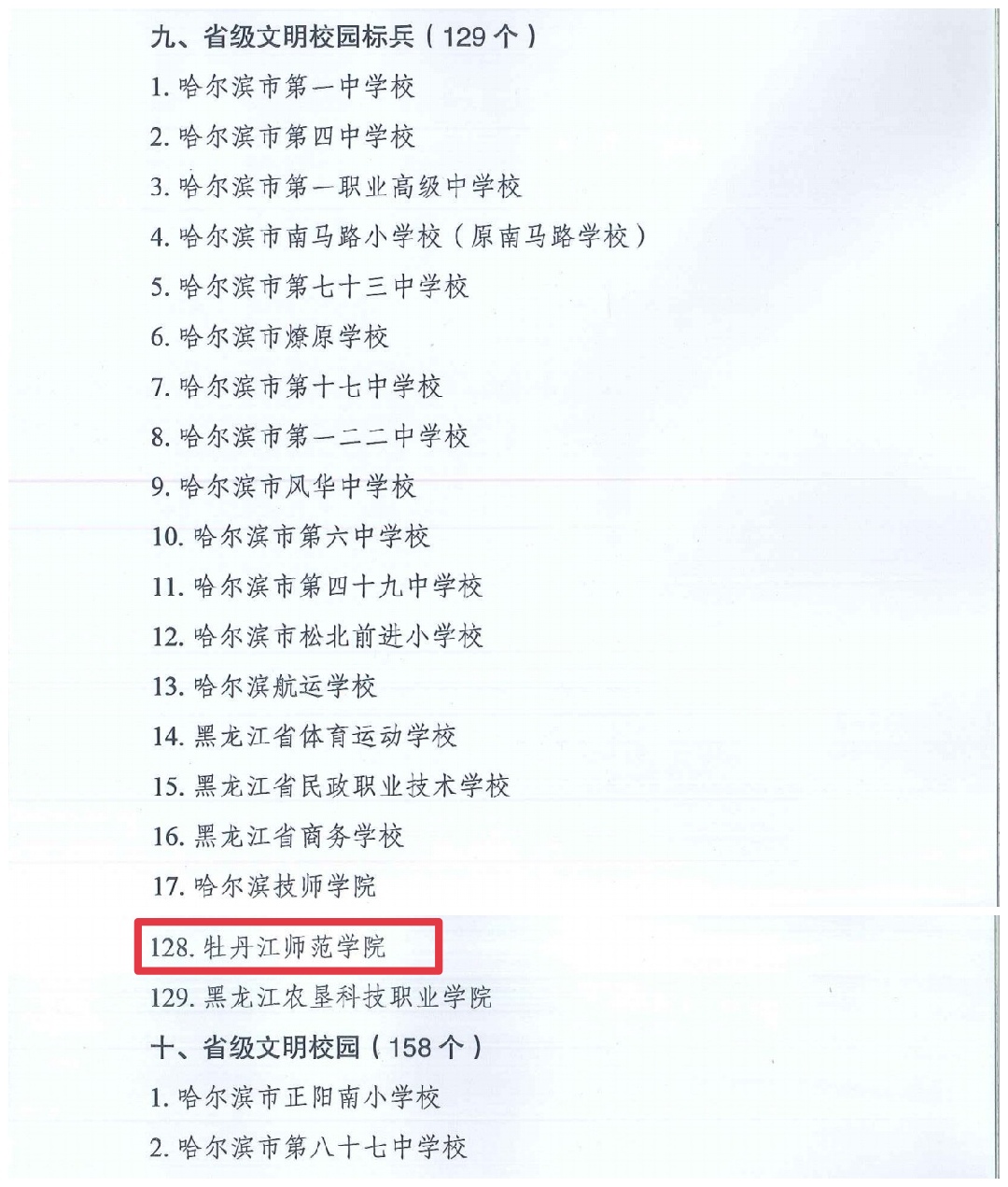 近日,中共黑龙江省精神文明建设指导委员会印发了《关于命名第二十届省级精神文明创建先进集体的决定》,我校获评“省级文明校园标兵”荣誉称号。