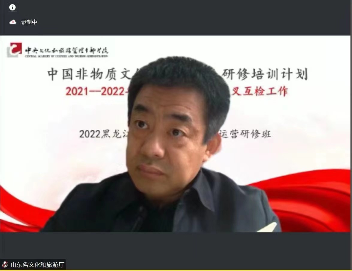 会上,宋娟教授向与会专家介绍了我校中国非物质文化遗产传承人研修培训计划项目开展情况,从教学组织、教学管理、保障机制、教学成果、反馈评价五个方面详细汇报了2022年黑龙江非遗新媒体传播与运营项目的实施情况,并同与会专家、全体参会人员一起观看了该项目专题片《云上守艺》。