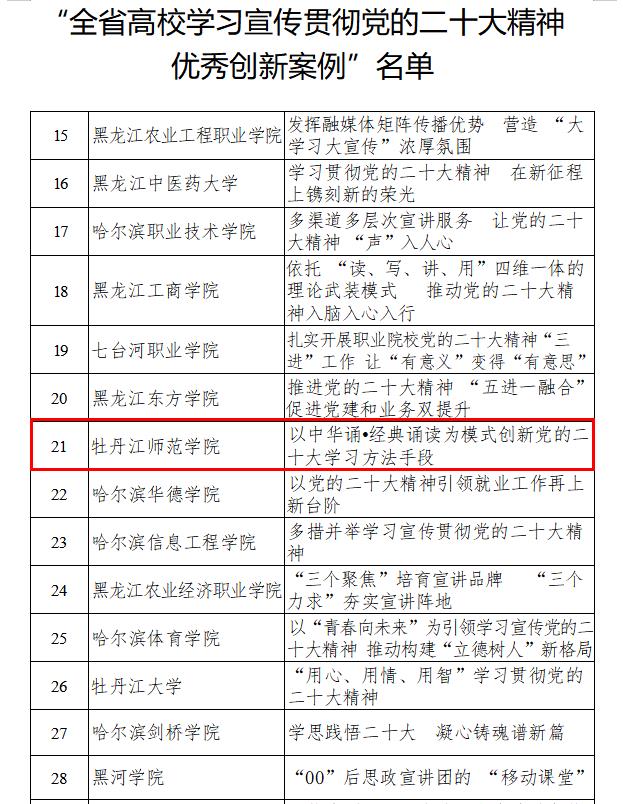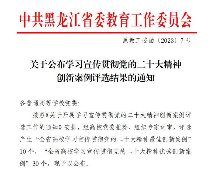 近日,黑龙江省教育工委公布了学习宣传贯彻党的二十大精神创新案例评选结果,我校报送的案例《以“五讲五进五结合”为抓手 创建党的二十大精神讲学用立体模式》获评“全省高校学习宣传贯彻党的二十大精神最佳创新案例”,《以中华诵·经典诵读为模式创新党的二十大学习方法手段》获评“全省高校学习宣传贯彻党的二十大精神优秀创新案例”。