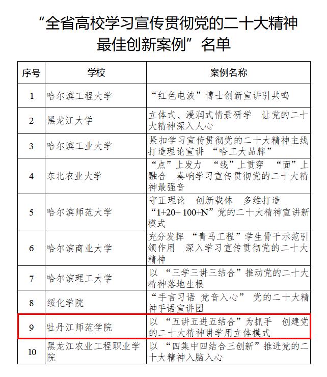 据悉,为集中展示我省高校深入学习宣传贯彻党的二十大精神的生动实践和工作成果,集中反映高校在形式载体、方法手段等方面的典型经验和亮点工作,黑龙江省教育工委组织开展了学习宣传贯彻党的二十大精神创新案例评选工作。经高校党委推荐、组织专家评审,评选产生“全省高校学习宣传贯彻党的二十大精神最佳创新案例”10个、“全省高校学习宣传贯彻党的二十大精神优秀创新案例”30个。