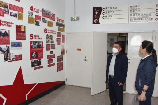 刘松副书记实地查看了位于图书馆二楼和三楼的走廊文化、电子屏等宣传阵地,并对宣传方向和展示内容提出了要求。宣传阵地要发挥思想引领和理论学习的重要作用,严格把关,大力宣传,打造优良的党建文化品牌。