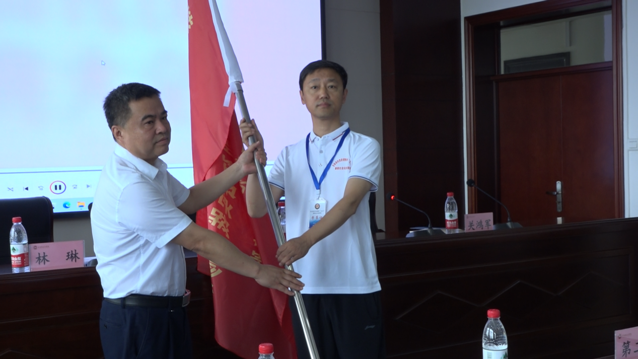 我校党委副书记刘松为本期研修班授班旗,研修班书记关鸿军教授代表全体学员接旗。