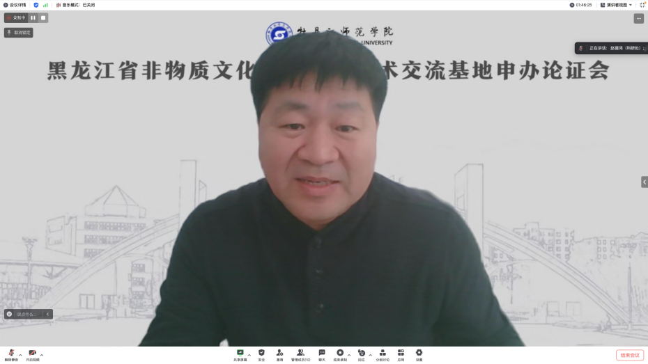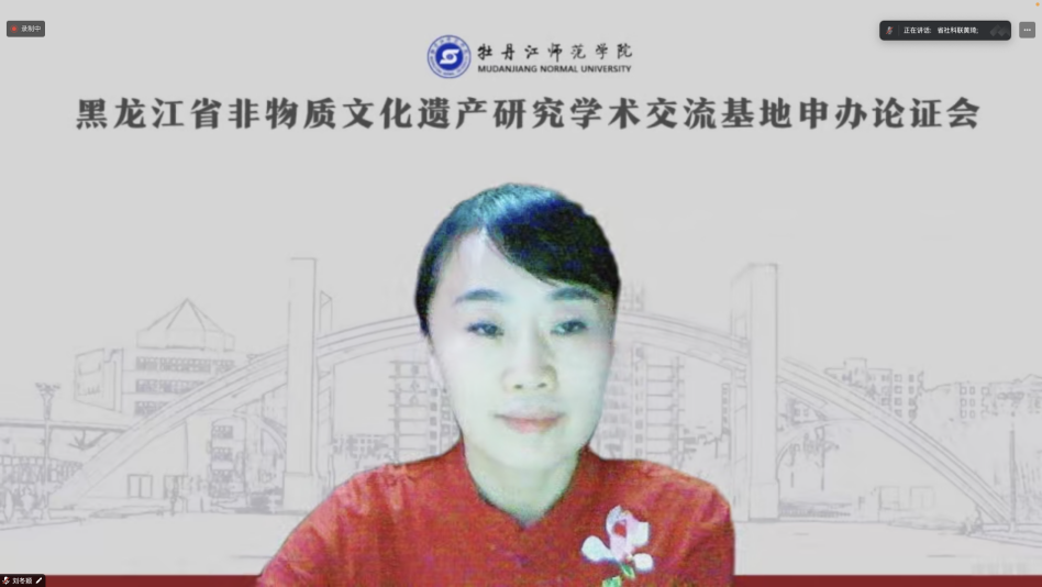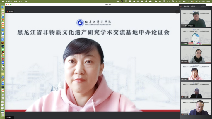 10月19日下午,我校黑龙江省非物质文化遗产研究学术交流基地申办论证会在线上举行。黑龙江省社会科学界联合会学会领导及论证专家,学会工作部副部长、二级调研员黄琦,学会工作部一级科员李涵婷,哈尔滨师范大学科技处副处长赵德鸿教授,黑龙江大学文学院教授刘冬颖;我校非遗研究工作协作单位代表、上海大学上海美术学院副院长章莉莉教授,牡丹江市融媒体中心广播综合频率主任姚凌涛及我校相关单位负责同志、教师代表参加会议。会议由我校文学院院长綦中明,副院长施新佳主持。