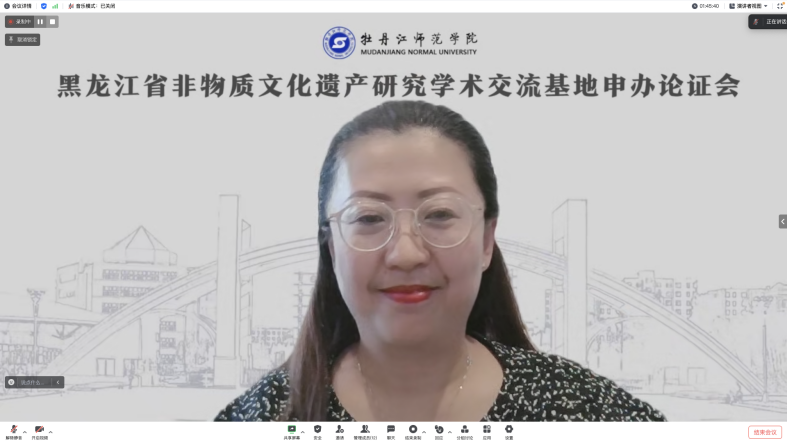 黑龙江省非物质文化遗产研究学术交流基地申办筹备负责人,我校省非遗教育研究基地主任、文学院宋娟教授从学校概况、受理情况、协作单位、可行性论证、基本思路与规划等五个方面详细汇报了拟创建非遗研究学术交流基地的相关情况,重点介绍了我校创建学术交流基地的四大优势,提出了建设非遗智库高地、非遗成果孵化站的未来工作基本思路与规划。
