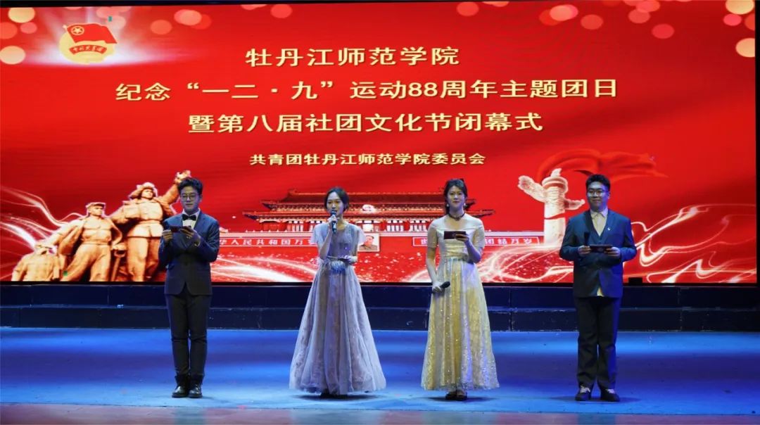 为深入学习贯彻习近平新时代中国特色社会主义思想,引领团员青年赓续红色血脉,厚植爱国主义情怀,坚定理想信念,表彰团内先优,选树青年榜样,12月11日晚,牡丹江师范学院纪念“一二•九”运动88周年主题团日暨第八届社团文化节闭幕式在第一音乐厅举行。学校领导党委副书记刘松、副院长、党委常委张艳霞、副院长张冰、副院长、党委常委张晓祥、以及各职能部处负责人、二级学院党委书记、副书记、团总支书记、辅导员、2023年新发展团员和全校团员和青年代表1100余人参加此次活动。