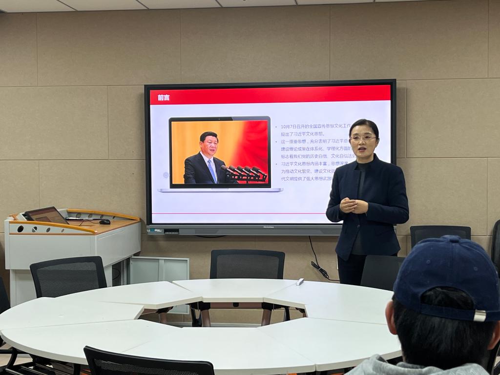 为深入贯彻落实习近平总书记关于大思政课的重要指示精神,有效发挥大思政课立德树人作用,坚持不懈用习近平新时代中国特色社会主义思想铸魂育人,12月11日下午,副院长张冰深入美术与设计学院,以《以习近平文化思想为引领坚定文化自信》为题,为青年学子讲授思政课。