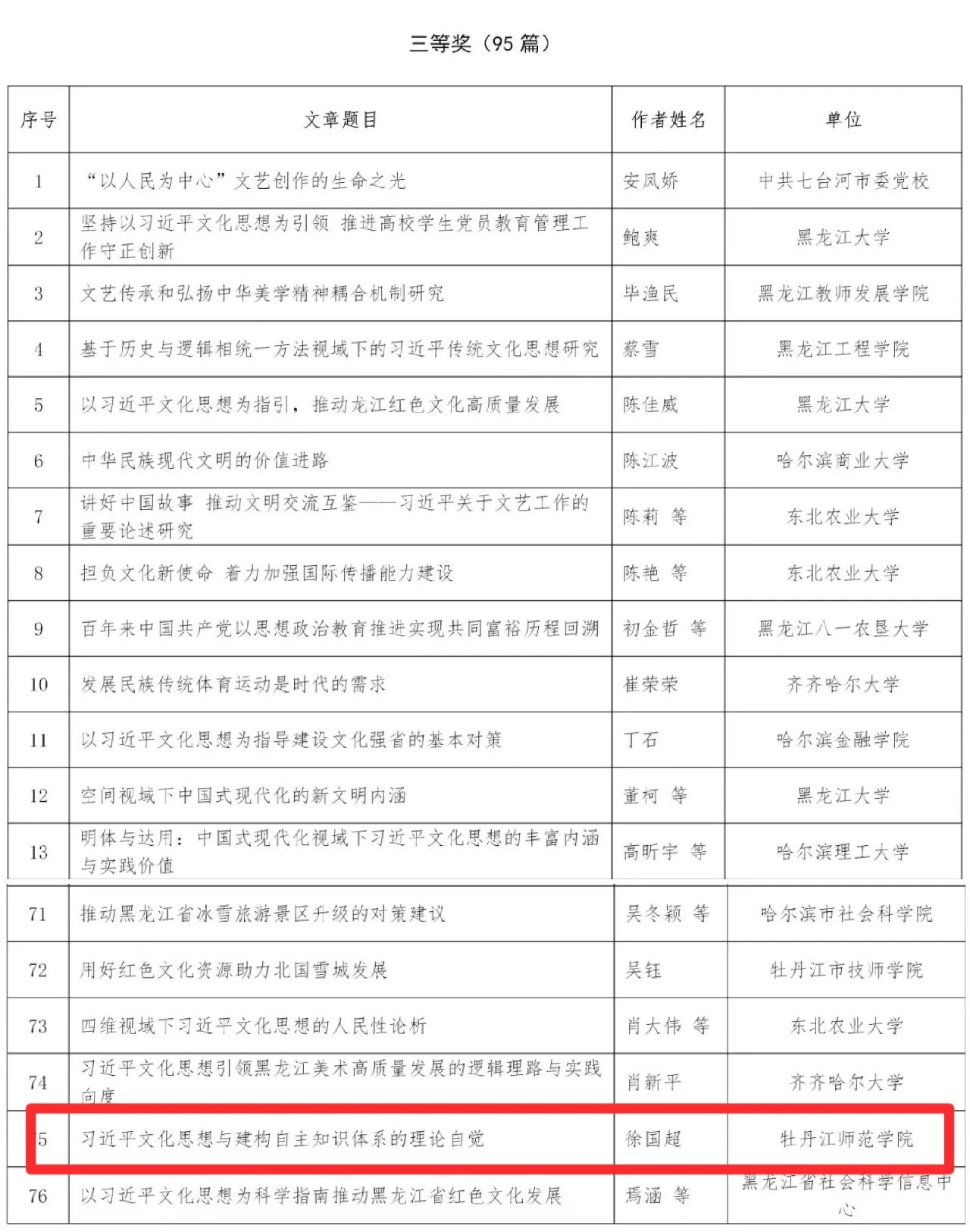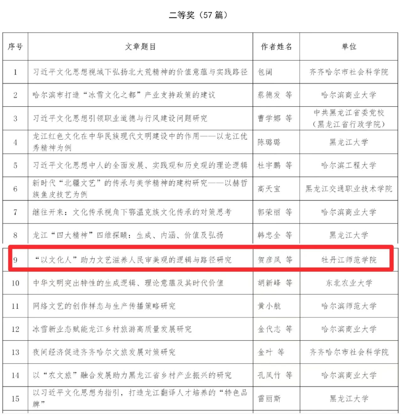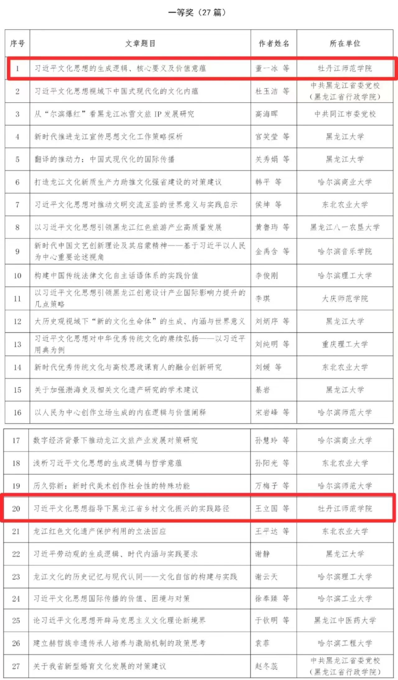 近日,由省社科联、省文联联合开展的“习近平文化思想研究”主题征文比赛公布获奖结果。我校喜获多项佳绩,其中,马克思主义学院教师董一冰的文章《习近平文化思想的生成逻辑、核心要义及价值意蕴》、历史与文化学院党委书记王立国的文章《习近平文化思想指导下黑龙江省乡村文化振兴的实践路径》荣获一等奖;马克思主义学院教师贺彦凤的文章《“以文化人”助力文艺滋养人民审美观的逻辑与路径研究》荣获二等奖;马克思主义学院教师徐国超的文章《习近平文化思想与建构自主知识体系的理论自觉》荣获三等奖。牡丹江师范学院社会科学界联合会荣获“优秀组织奖”。