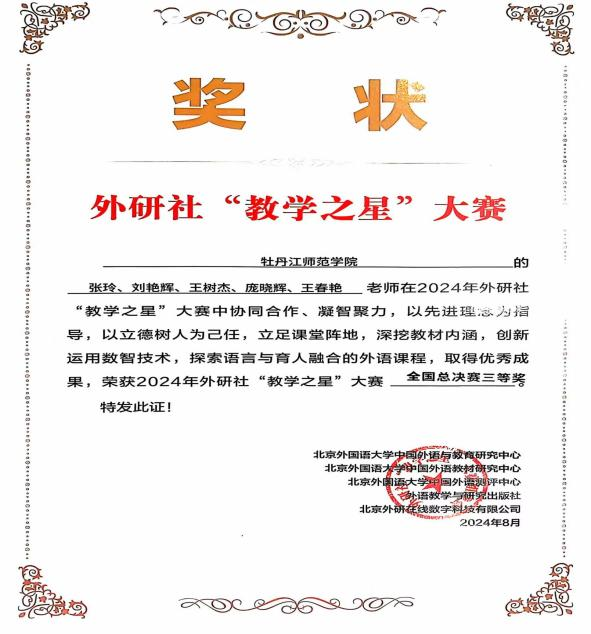 接到赛讯后,由我校西方语言学院教师张玲、刘艳辉、王树杰、庞晓辉、王春艳组成的“理解当代中国”教学团队,结合大赛主题,精心选择了参赛单元,并认真完成了教学设计方案和教学展示视频的录制。团队提交的参赛材料最终在全国“理解当代中国”组149个参赛团队中脱颖而出,获得了全国复赛特等奖以及全国半决赛的比赛资格。获得全国半决赛比赛资格后,团队教师积极备赛,认真钻研,精心打磨并完善课程。教学团队于2024年8月1日赶赴合肥,与来自全国包括华中农业大学、广东外语外贸大学等高校23个优秀的教学团队同台竞赛,最终取得了全国半决赛二等奖,全国总决赛三等奖的好成绩。