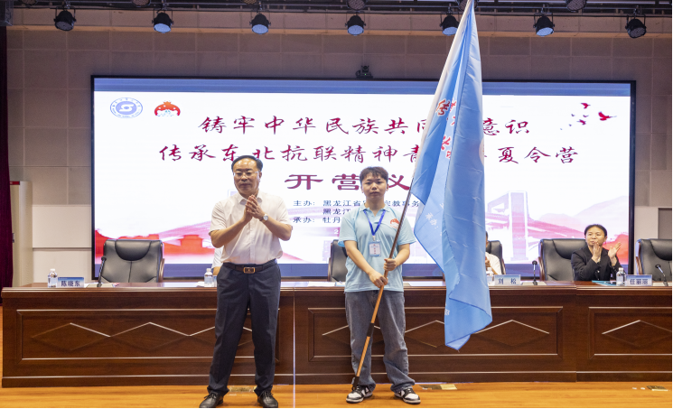 黑龙江民族宗教事务委员会副主任、党组成员陈青为夏令营授旗