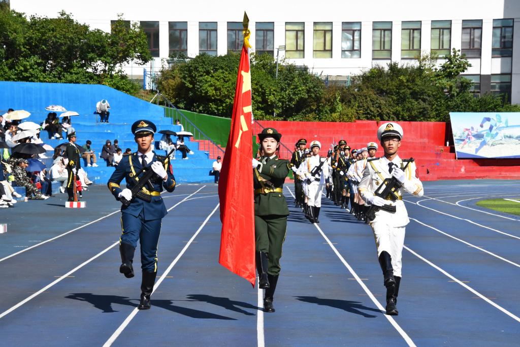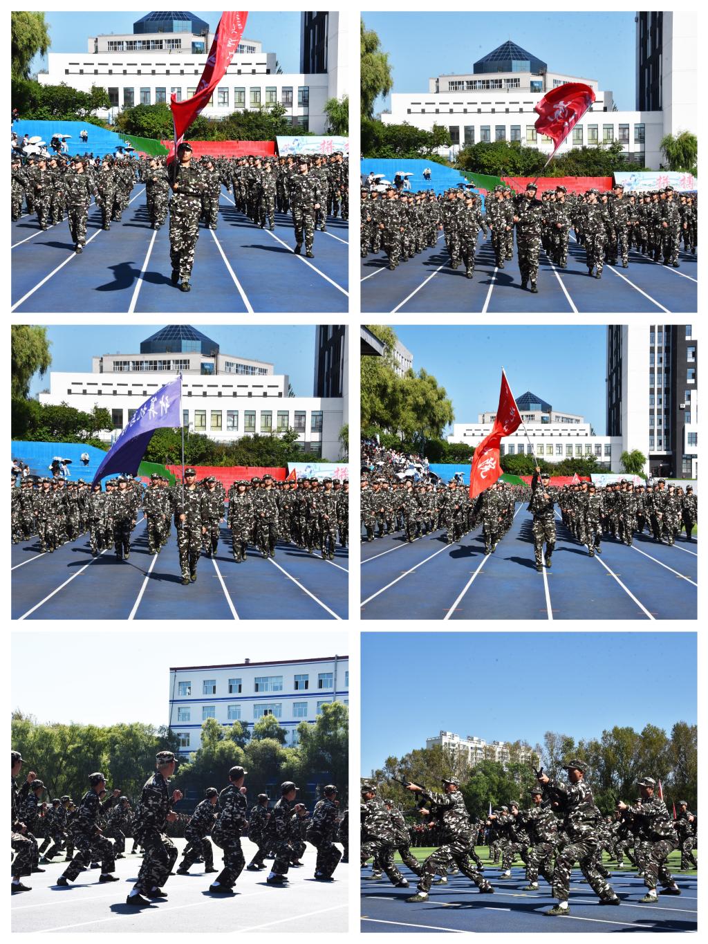 在庄严的国歌和激昂的校歌声中,国旗、校旗先后在田径场上冉冉升起,全体师生面向国旗行注目礼。随后,各二级学院方阵迈着整齐的步伐陆续经过主席台接受检阅,饱满的精神、挺拔的军姿、矫健的步伐、嘹亮的口号充分展示了牡师院青年学子锐意进取、自信昂扬、团结向上的精神风貌,精彩的分列式表演完美呈现了军训的丰硕成果,赢得了在场师生阵阵掌声。体育与健康科学学院18连带来了军体拳、刺杀操等汇报表演,每一次出拳都刚劲有力,每一次踢腿都势如破竹,气势非凡,场面震撼。