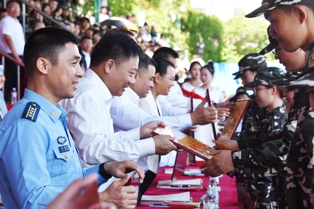 会上,党委书记王志浩为承训部队赠送锦旗。军训师副师长、学校副院长张冰宣布2024级学生军训嘉奖令,校领导分别为获奖集体和个人颁奖并佩戴校徽,为优秀教官代表颁发证书。新生代表闫佳琪、杨越,在校生代表耿振溥,教师代表吕威分别发言。