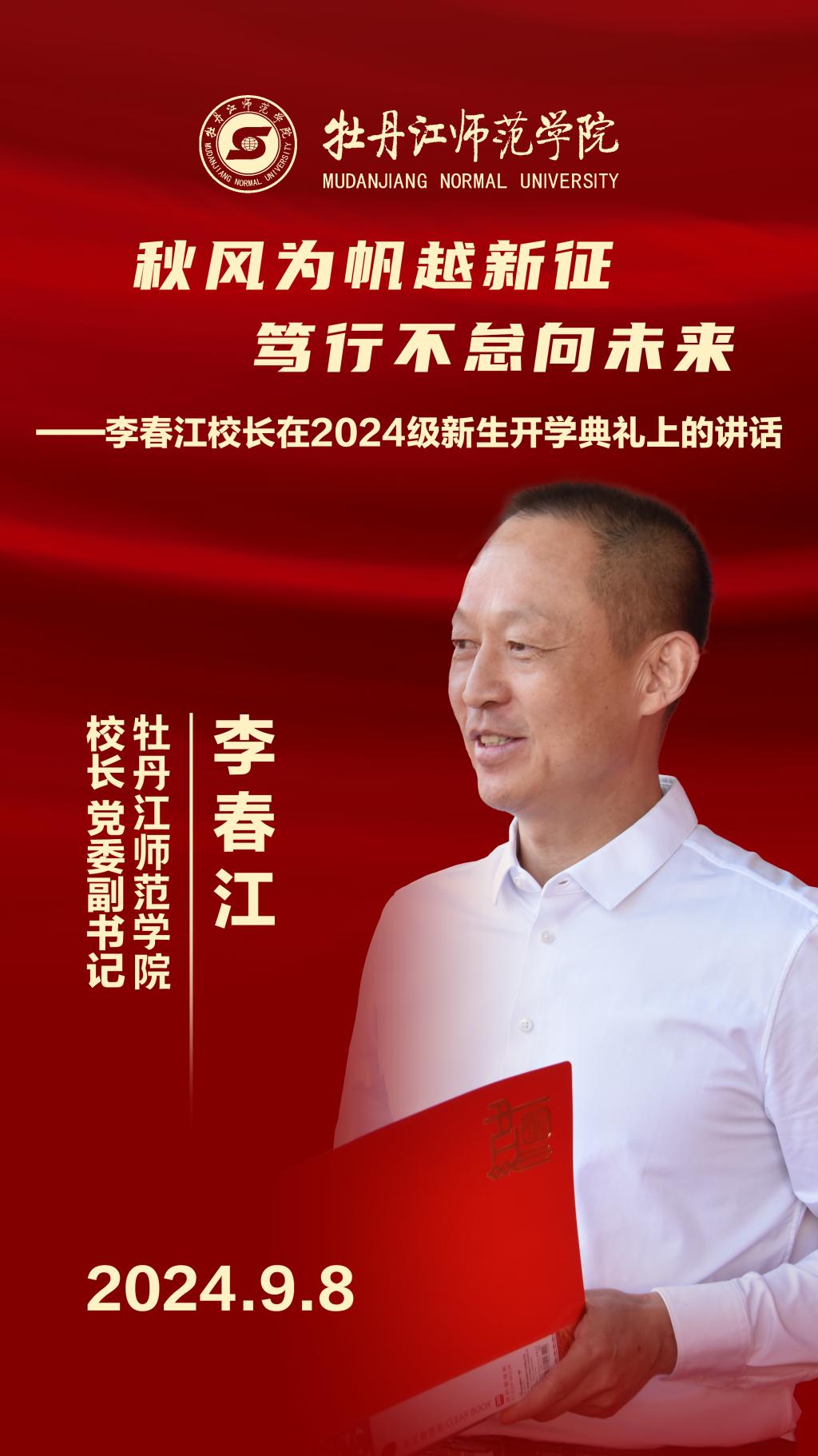 院长、党委副书记李春江在大会上讲话,为2024级新生讲授“开学第一课”。李春江院长对全体2024级新生提出三点希望:一是自律使你坚定,要在自律中汲取成长的力量,收获广博的知识、健康的体魄、积极的心态和优秀的品格,在自律中慢慢靠近更好的自己,以逐梦青春的汗水,换取圆梦时那一抹最璀璨的笑容。二是感恩使你温暖,要感恩伟大的党和祖国,给了我们自立自强的骨气;感恩父母和老师,给了我们追逐梦想的底气;感恩师哥学姐和同学,给了我们面对挫折的勇气;追逐榜样、追求理想,用刻苦换进步,砥砺奋进。三是学习使你强大,要把精力用在钻研学业上,善学习、常读书,努力做到学有所思、学有所悟、学以致用,让行动带来改变,成为有理想、敢担当、能吃苦、肯奋斗的新时代好青年。李春江院长寄语全体新生,牢记习近平总书记的殷切嘱托,不负青春韶华,汲取奋进力量,薪火相传牡师精神,在潜心学习钻研中描绘壮美青春画卷。