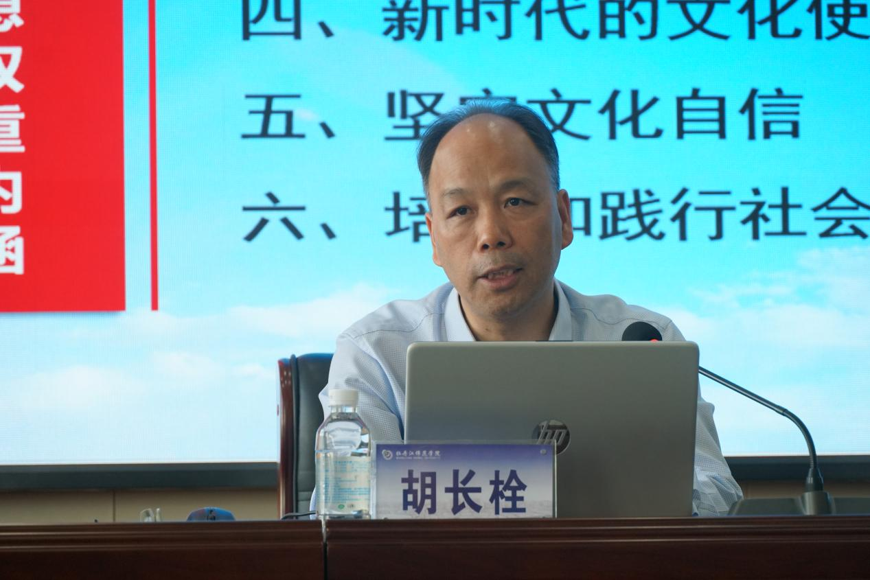 9月24日下午,学校邀请中央党史和文献研究院第四研究部副主任胡长栓同志在综合楼1306会议室作了题为“习近平文化思想的本质是先进文化”的专题辅导讲座。各基层党委、党总支、直属党支部书记,各职能部门负责人,师生代表参加会议。会议由党委宣传部部长陈晓东主持。