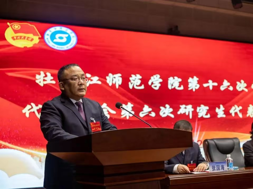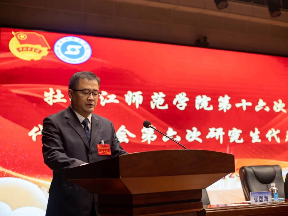 校团委书记张国海代表学校团委向大会的召开表示热烈的祝贺,并在讲话中提到校学生会、研究生会在多方领导和指导下,牢记总书记嘱托,见证学校教育事业和团学工作成就,青年学子们在多方面展现青春风采。本次大会肩负学校党委殷切希望和全校青年学子重托,各位代表应珍惜时刻、分享荣耀、肩负使命、展望未来,在实现中国梦、师院梦、成才梦的征程中再创辉煌。