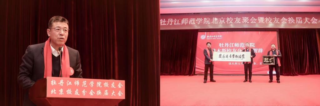 随后,佳木斯分会孙文生会长、牡丹江分会陶可贤秘书长,向北京分会赠送了校友纪念品,表达了各地校友们的深厚情谊。
