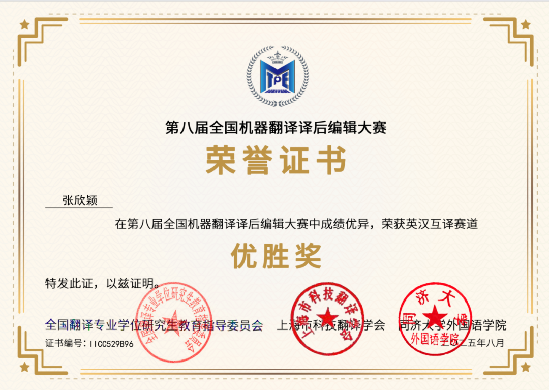 近日,第八届全国机器翻译译后编辑大赛圆满落幕。我校应用英语学院学子继去年摘得特等奖后再次夺魁,2024级翻译硕士研究生张相宜、王晓彤、张欣颖三位同学凭借卓越实力,分获一等奖、二等奖和优胜奖。黄永媛、孙海一、沈艳蕾三位老师荣获“优秀指导教师”。颁奖典礼上,张相宜同学作为获奖代表线上发言,分享参赛心得与成长感悟,展现了我校学子出色的专业素养与精神风貌。